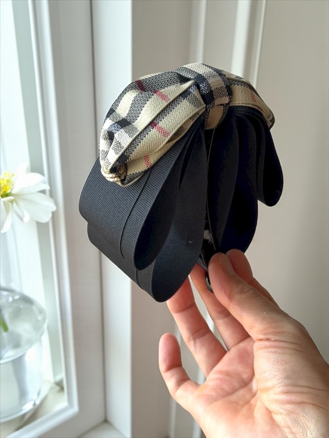 垂れ下がりリボン バナナクリップ nana-R ベージュチェック柄