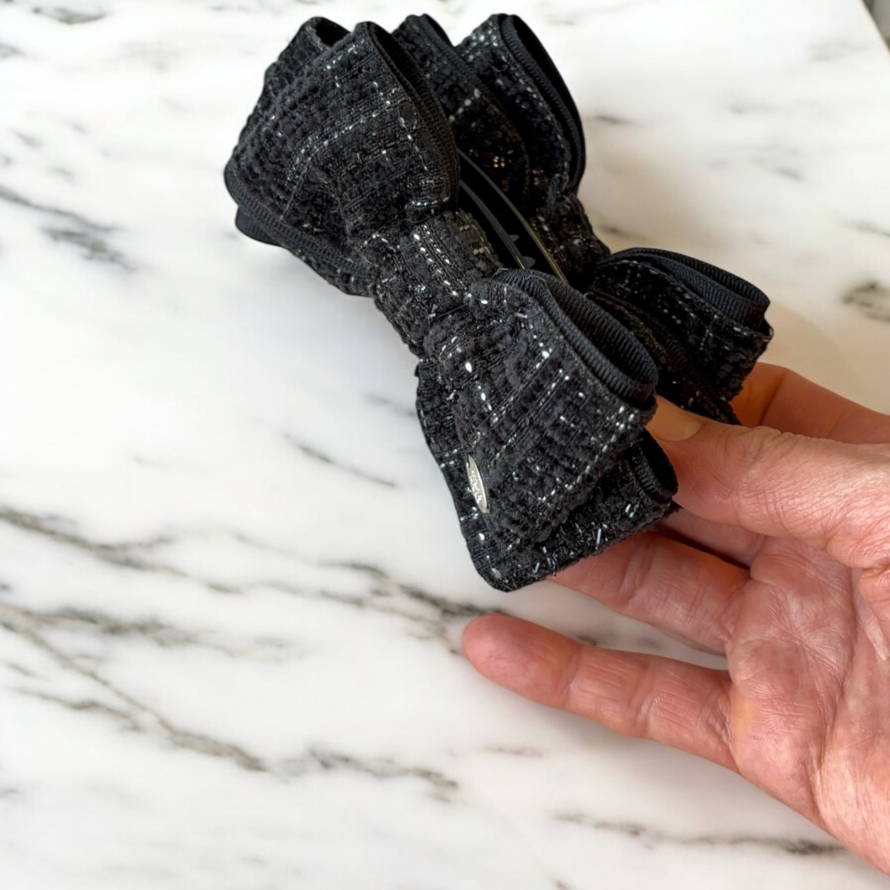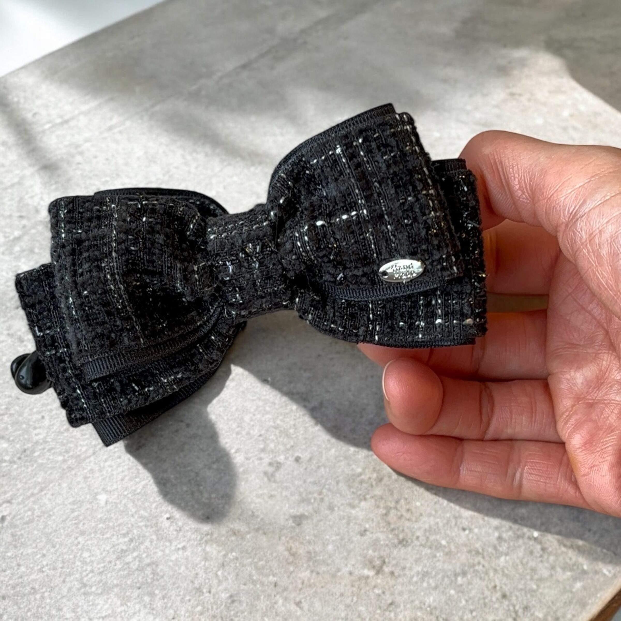 キラキラと輝くツイード素材を使用した、あえてシンプルな形のリボンスタイルが愛らしいバナナクリップです。