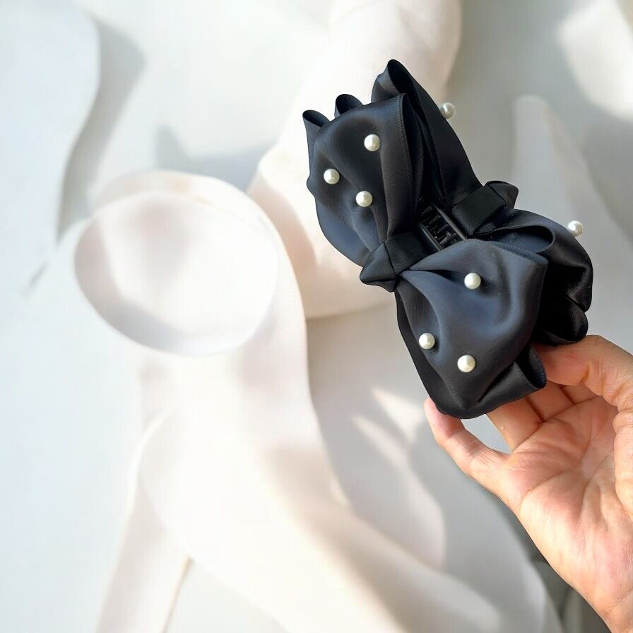大きめバナナクリップ パール付き ツヤツヤサテンリボン