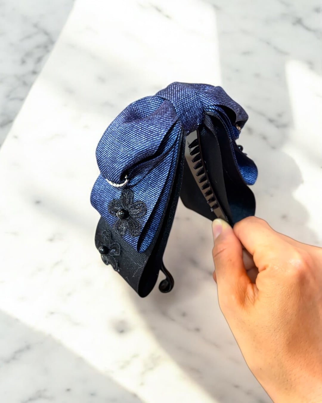 ■デニム柄 nana-R リボン ブラックフラワー付きバナナクリップ