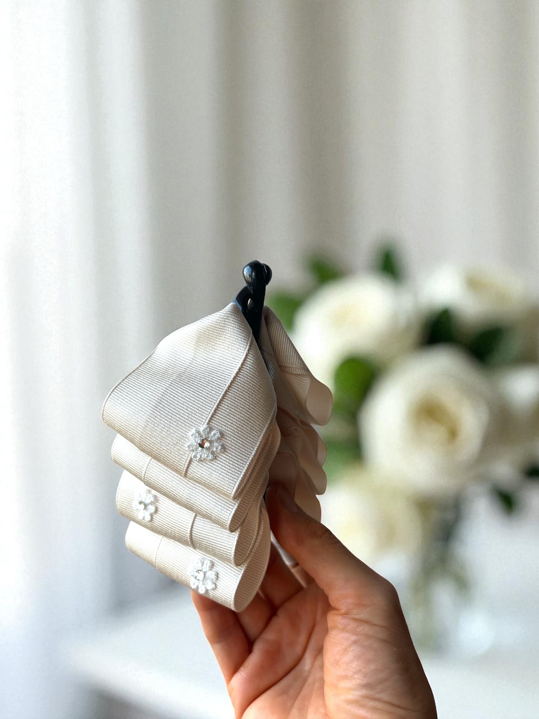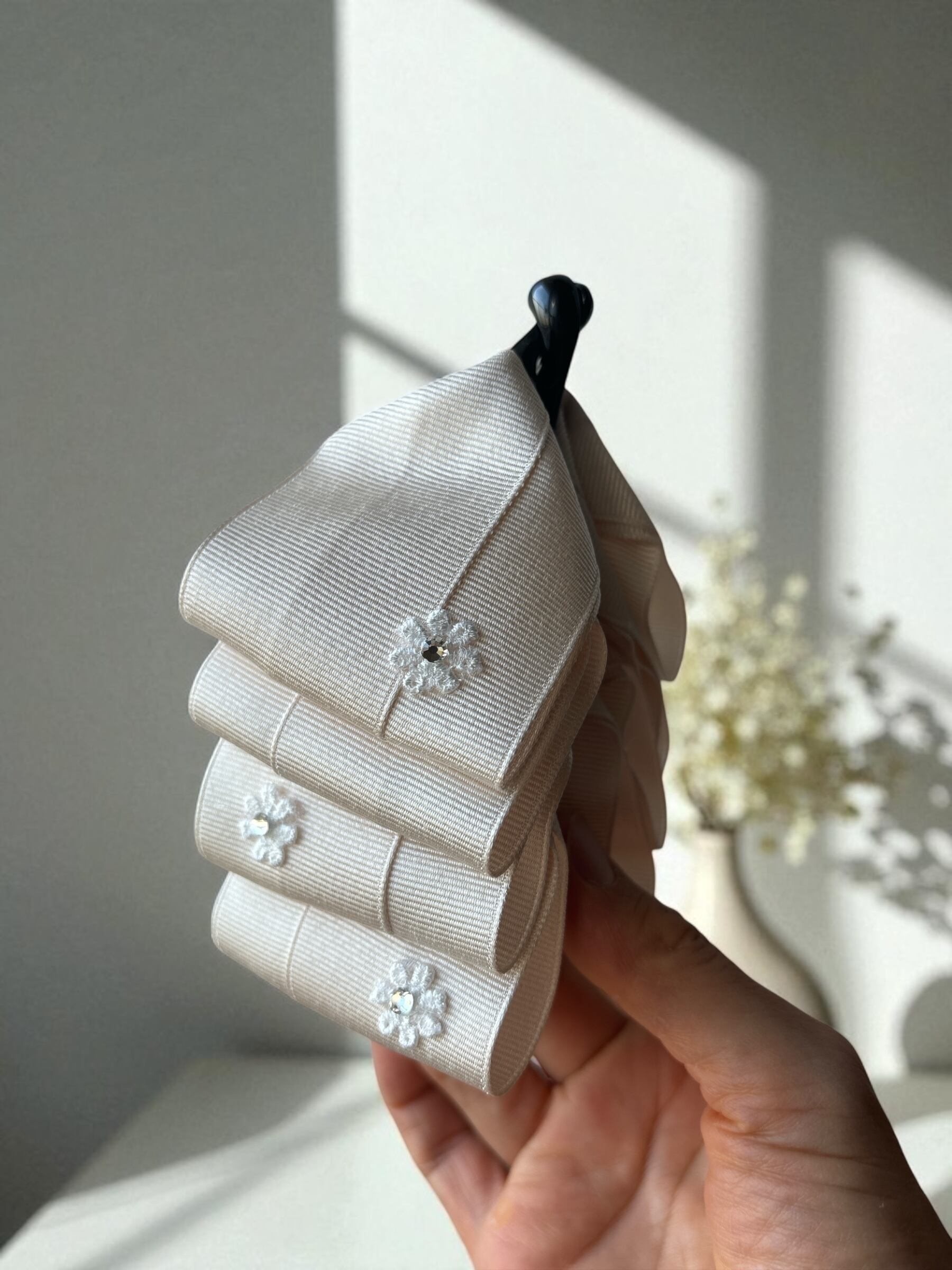 アイボリーのリボンに、きらりと輝くラインストーン付きのお花を乗せ可愛らしさと上品さを