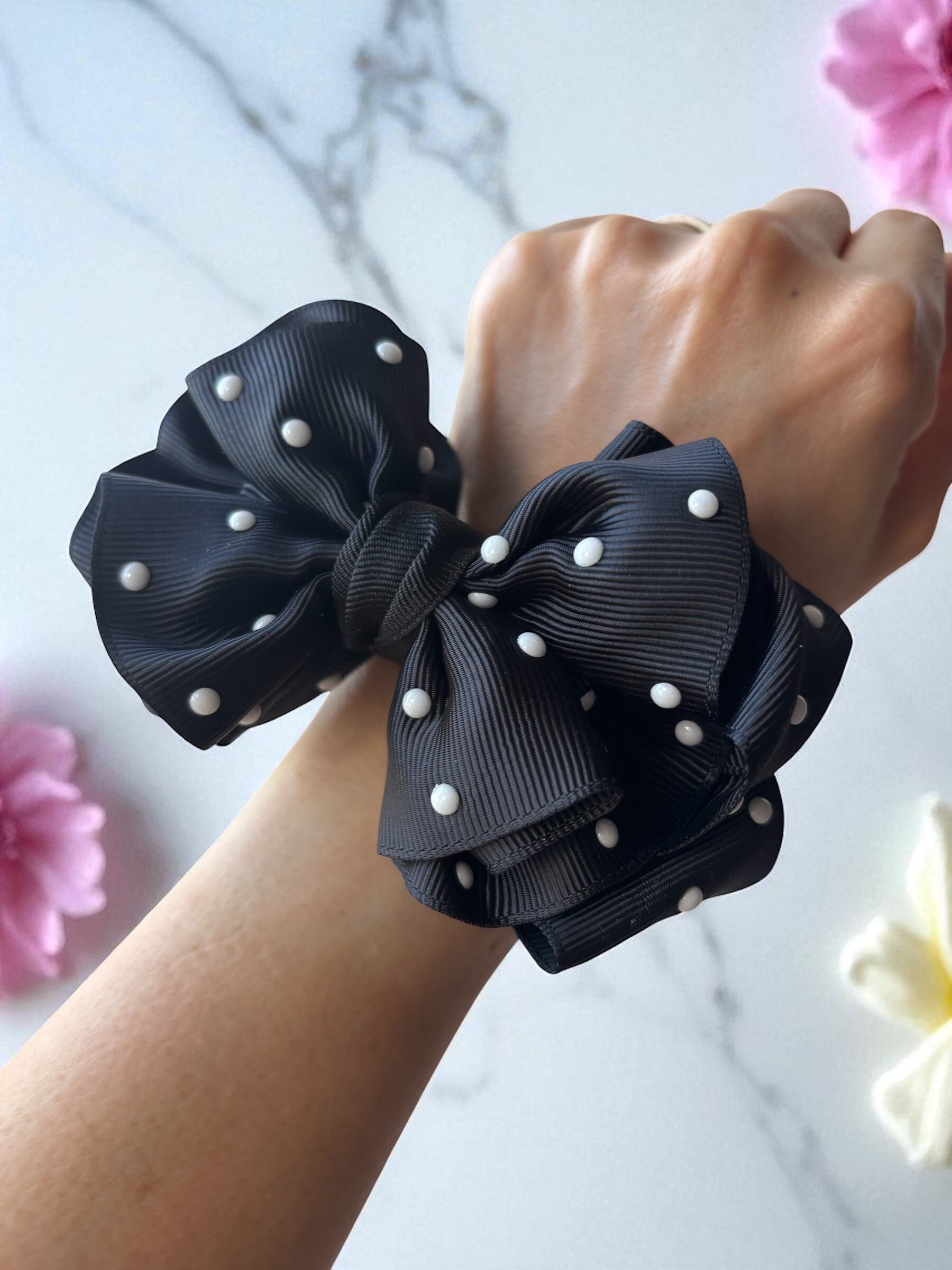 ボリュームたっぷりのフリルシュシュは、パールドットのリボンで華やかに仕上げました。