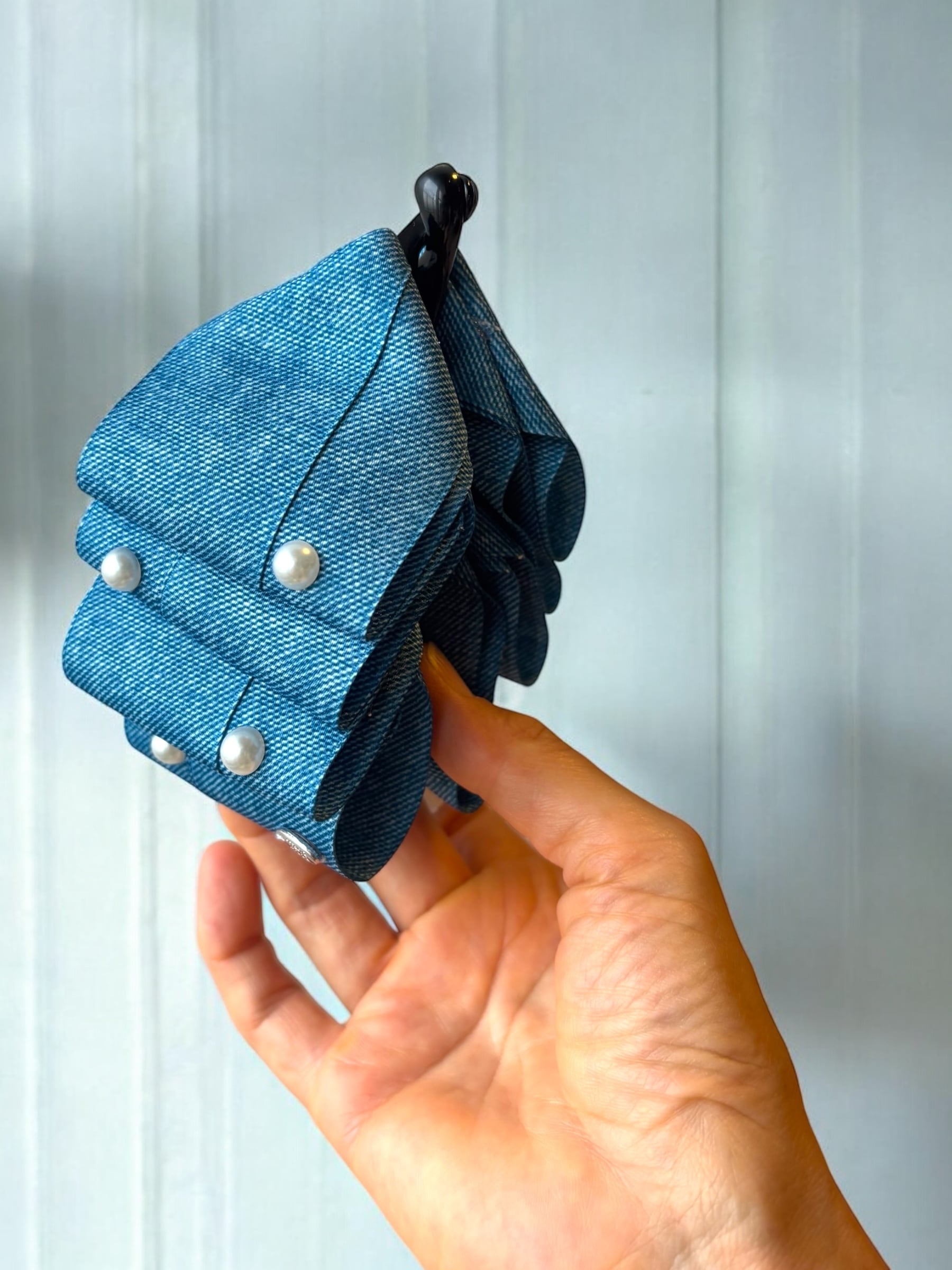 Lily bell たらりんリボン アレンジバナナクリップ デニム風リボン×パール