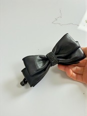 ほどよいボリューム感のリボンに、中央のキラキラキラなブラックストーンが上品に輝き、クールな中にも女性らしさを感じさせるデザインです。