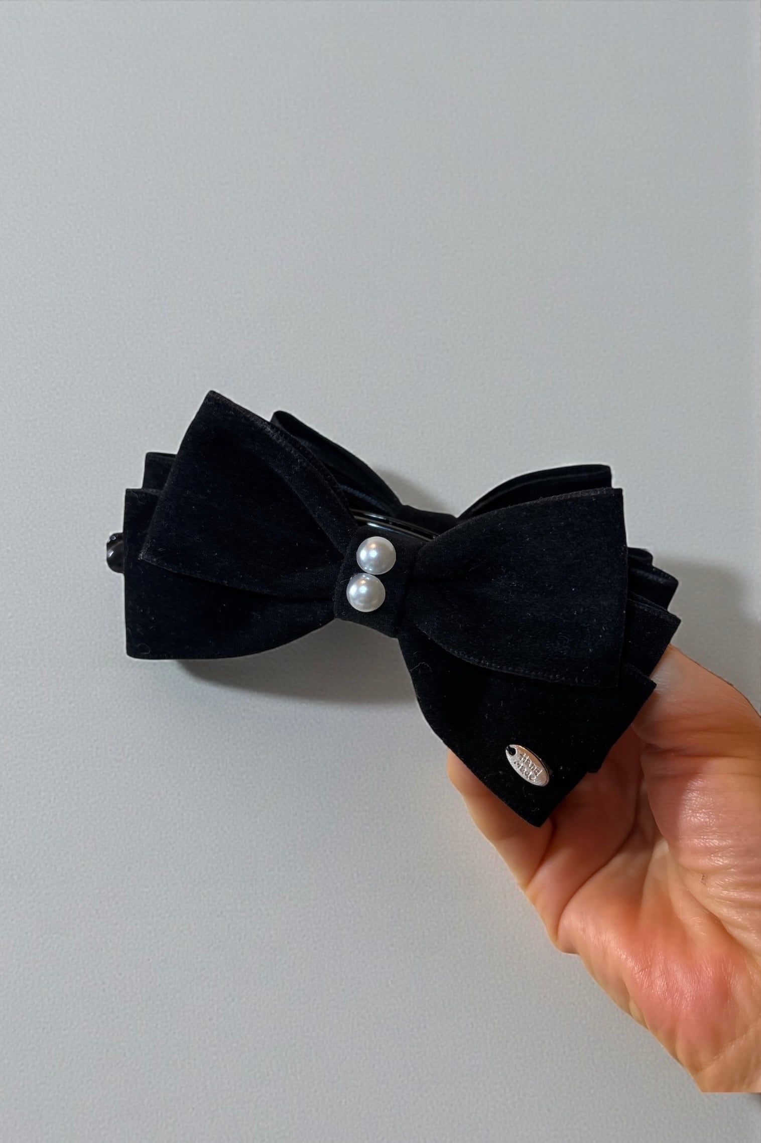 上品なスエード素材を使用したリボンが特徴のバナナクリップです。パールのアクセントが華やかさをプラスし、特別なホリデーシーズンのスタイルを引き立てます。