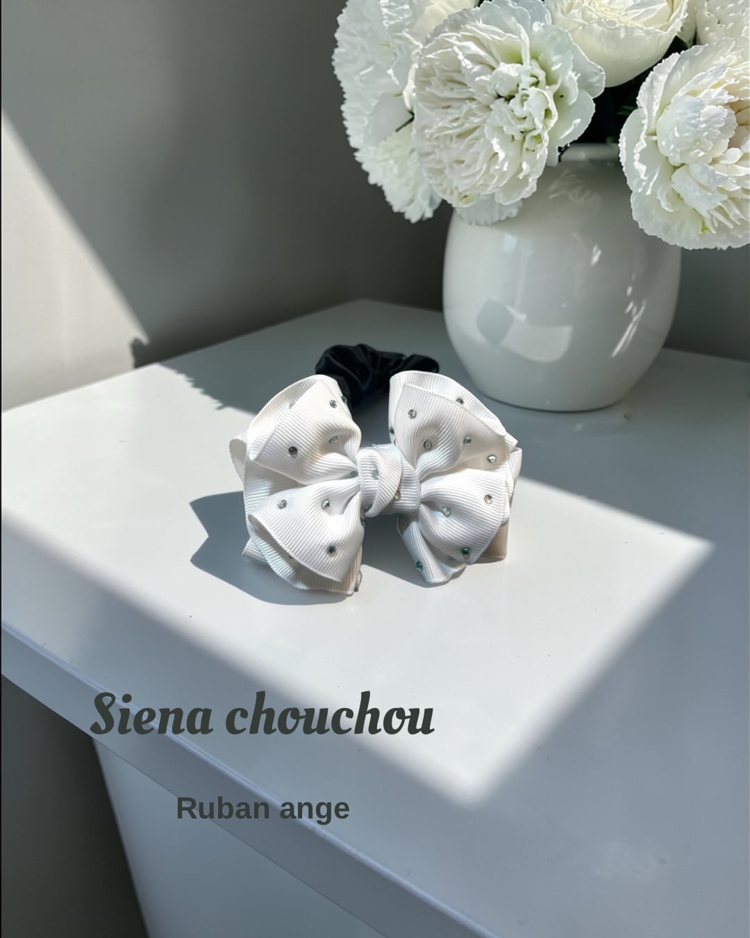 ボリュームたっぷりのホワイトグログランにシルバーストーンが付いたシエナリボンシュシュは、三段重ねでたっぷりリボンを使用しています。