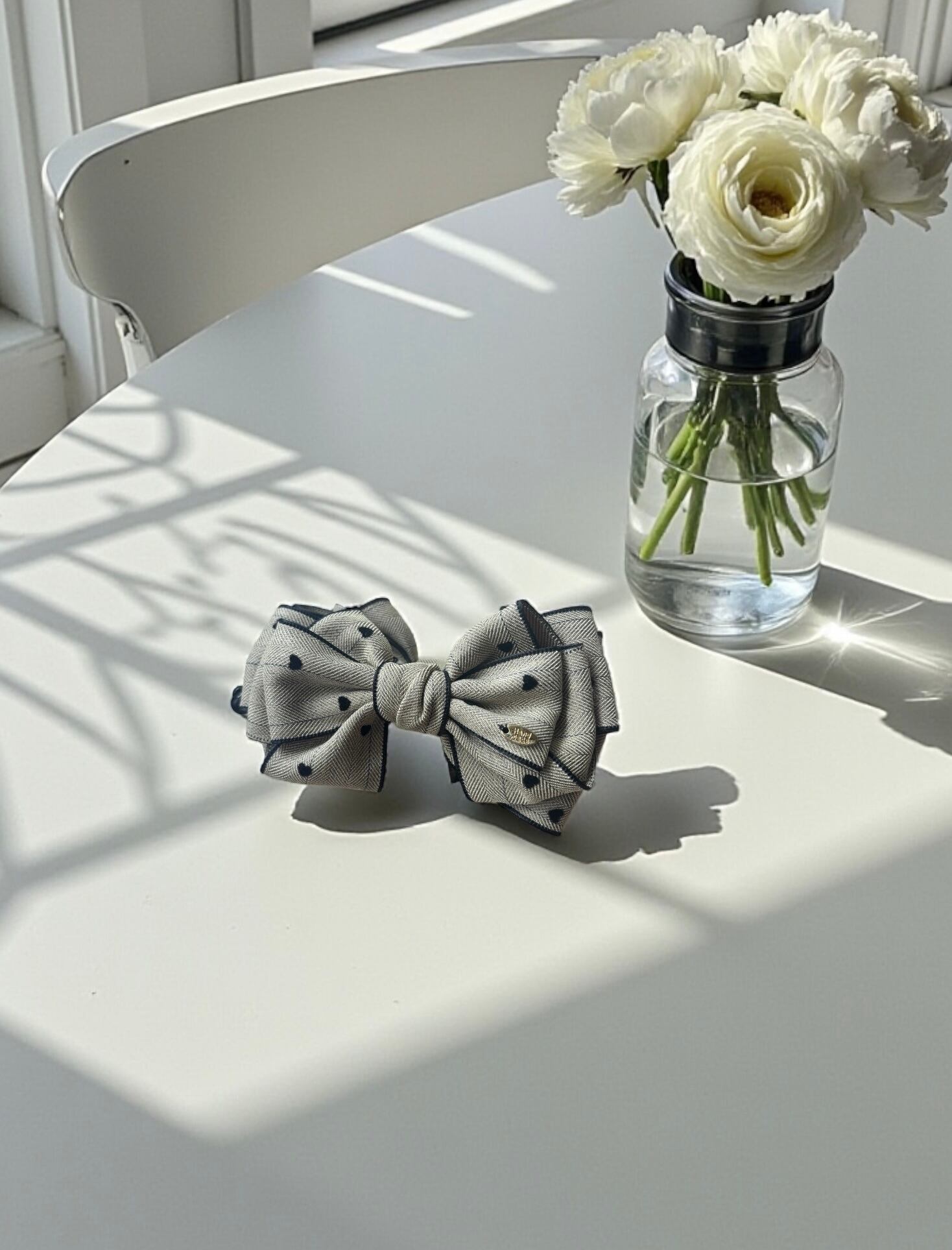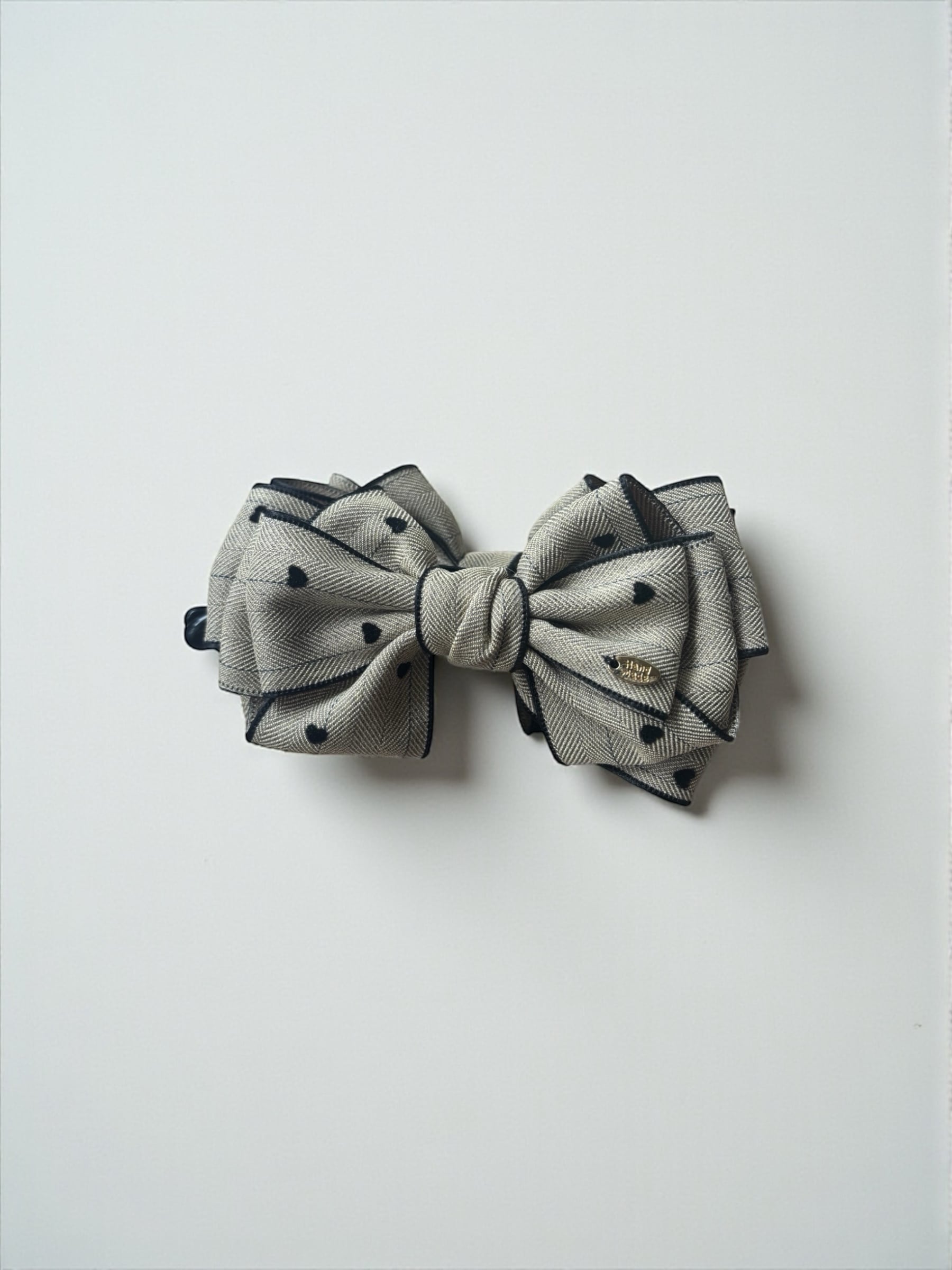 ■ chicsweet バナナクリップ ベージュ ファブリックリボン×ブラックハート|シックで可愛らしいヘアアクセサリー