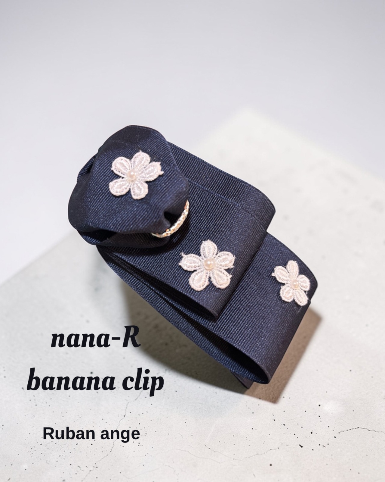 ■nana-Rバナナクリップ ネイビー×ホワイトフラワー たらりんリボン
