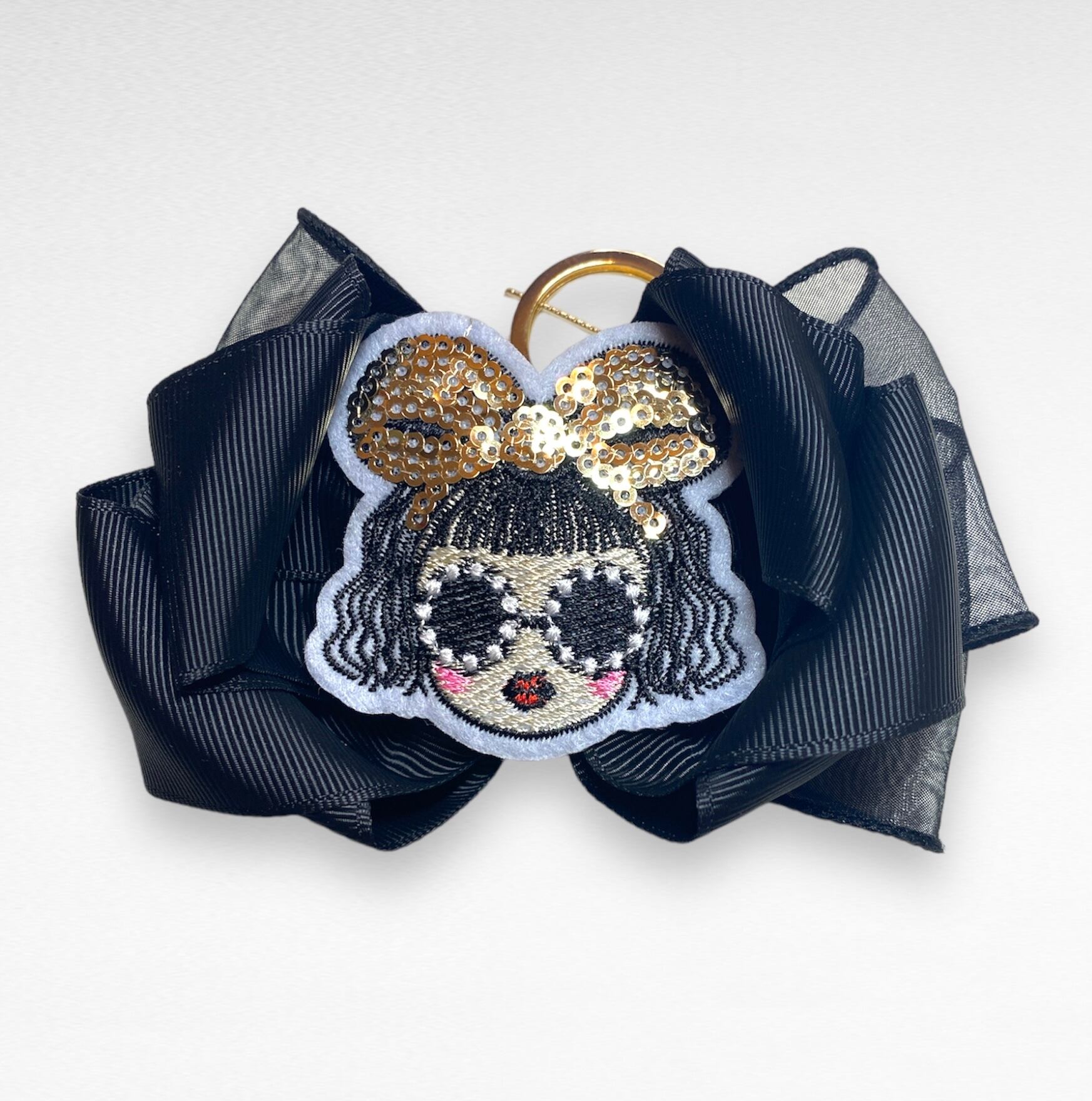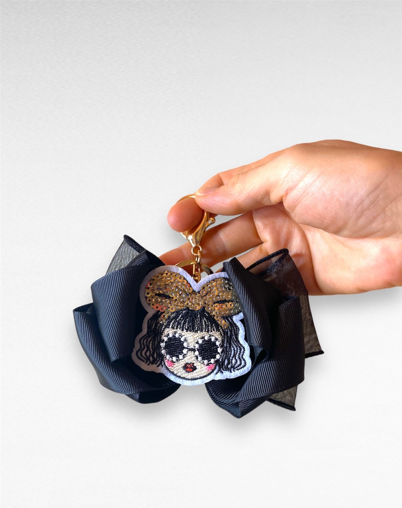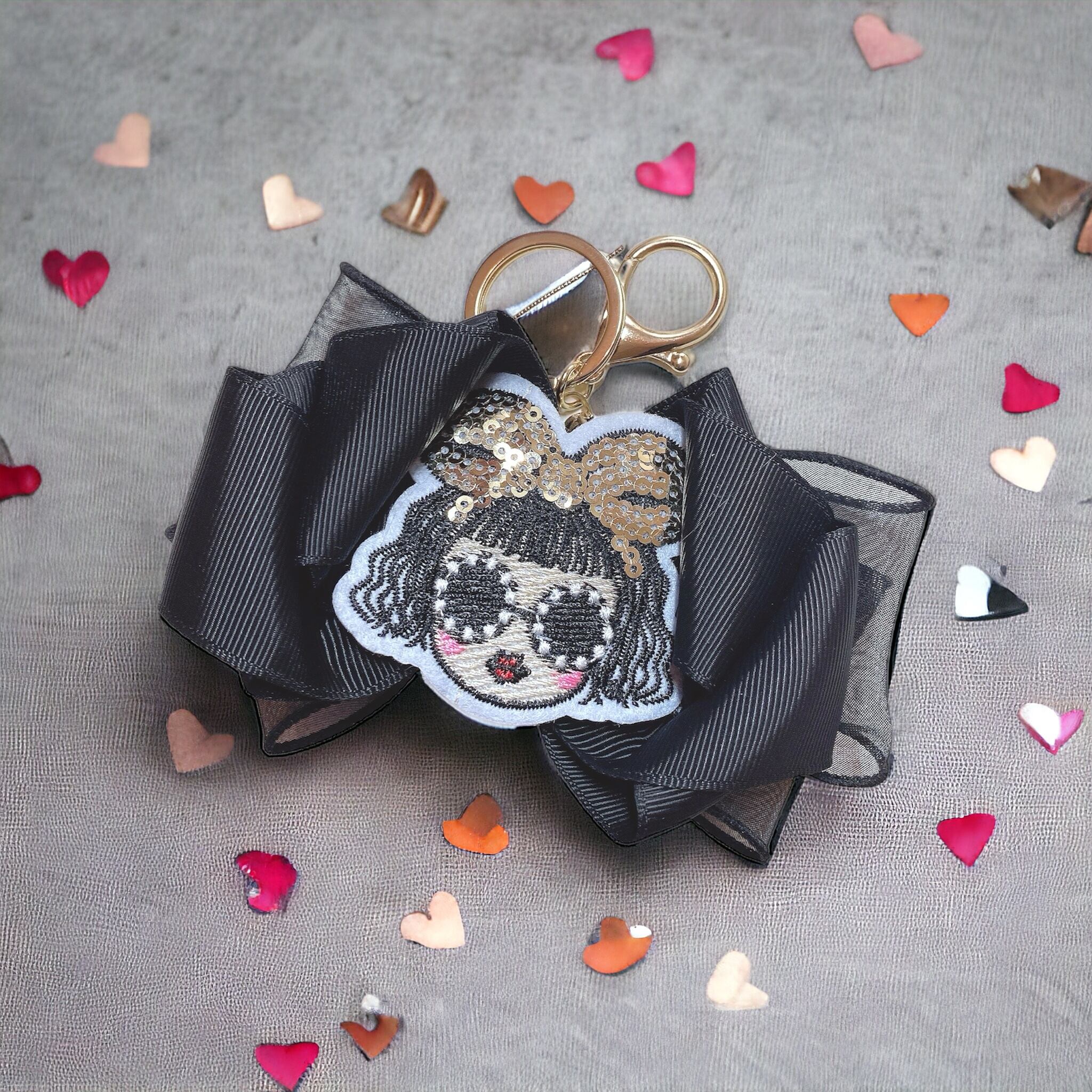 華やかなクロスリボンに女の子のバッグチャーム