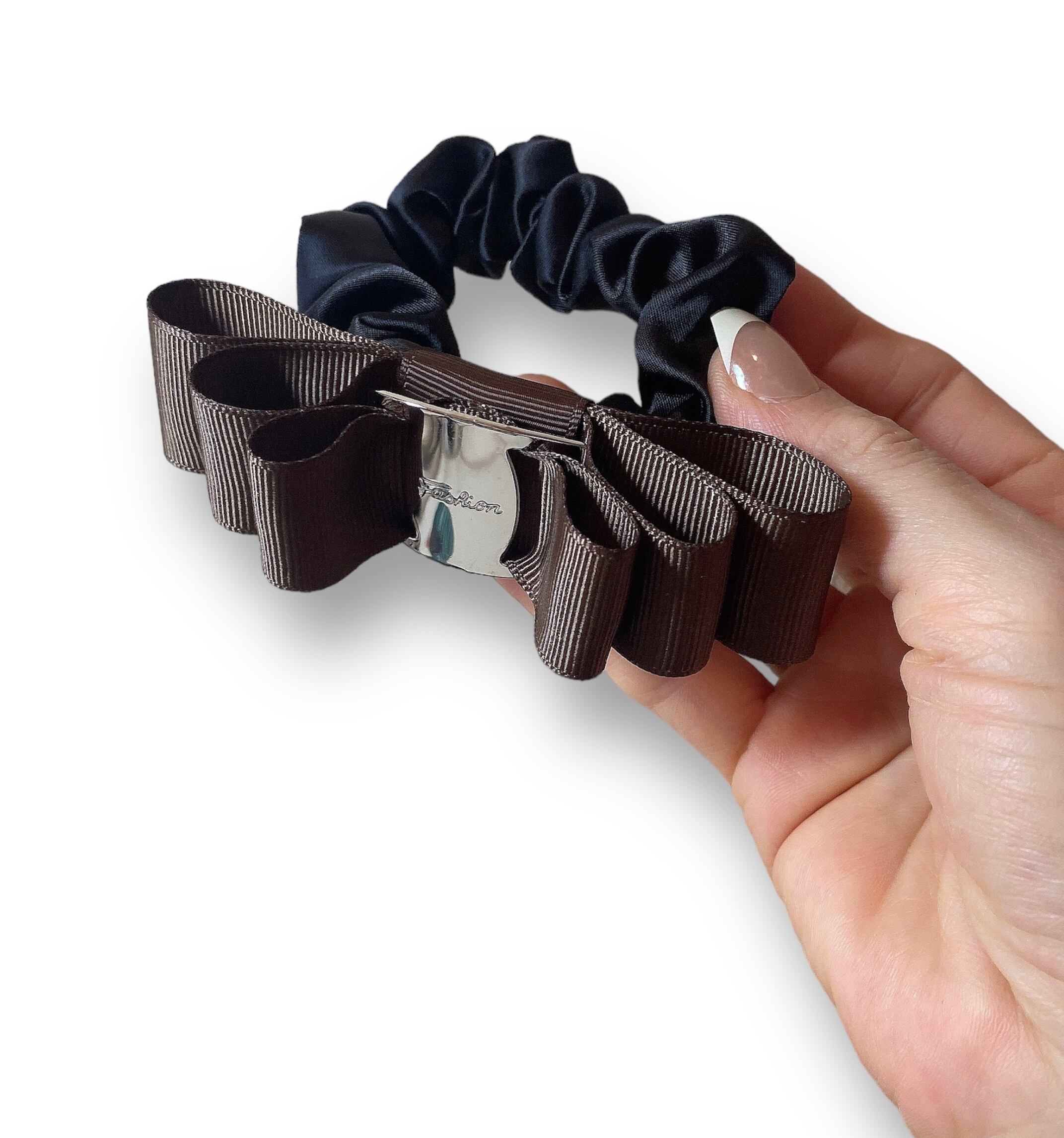 ブラウンリボン×シルバーバックル 3段 重ね リボン シュシュ