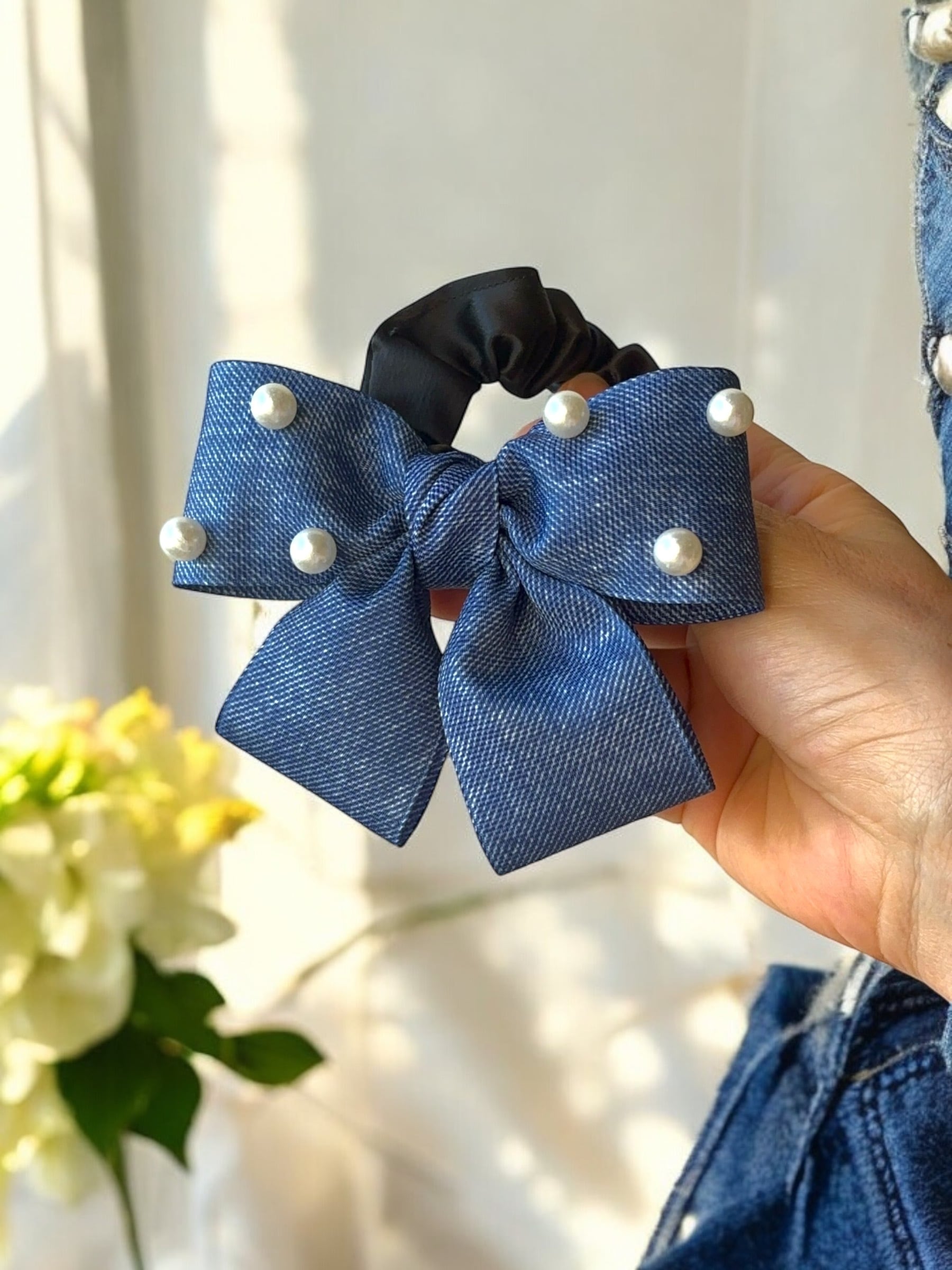 デニム柄リボンにパールが華やかさを添えたシュシュ