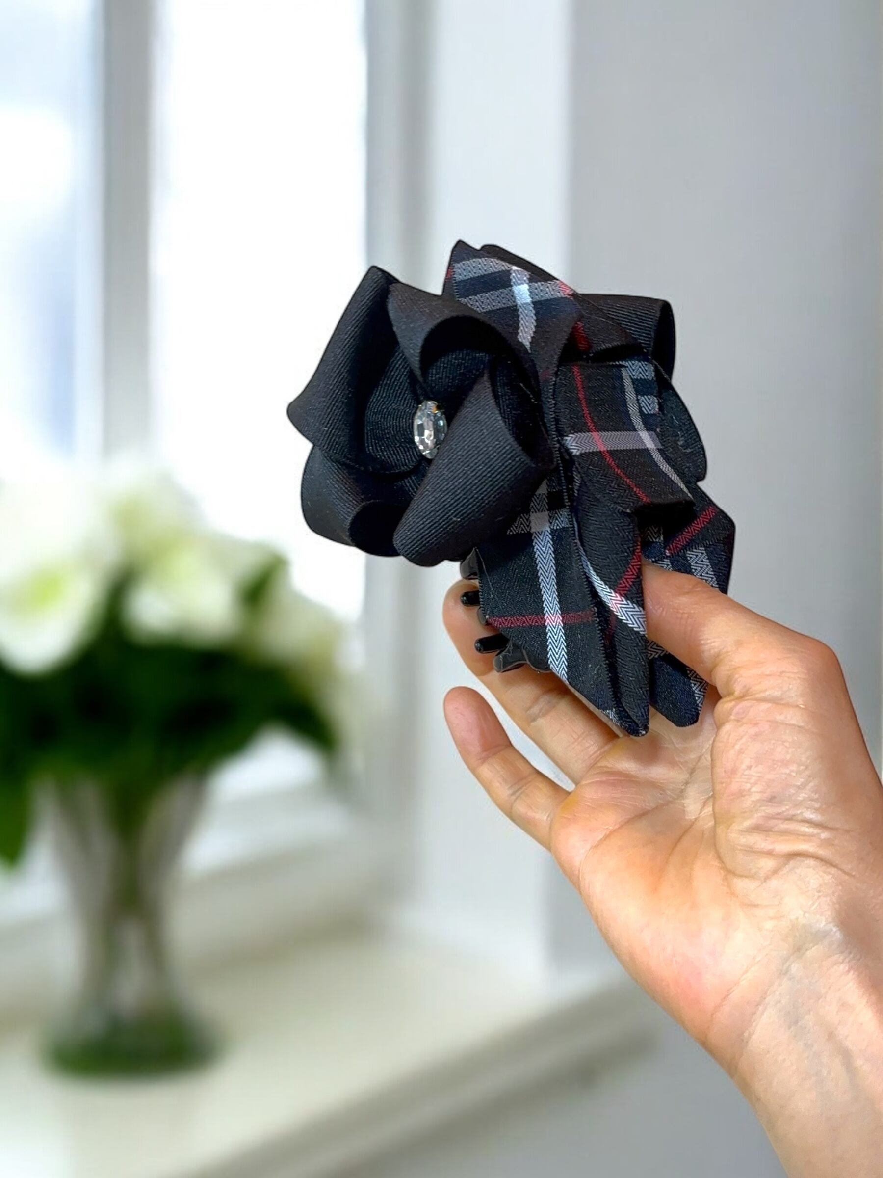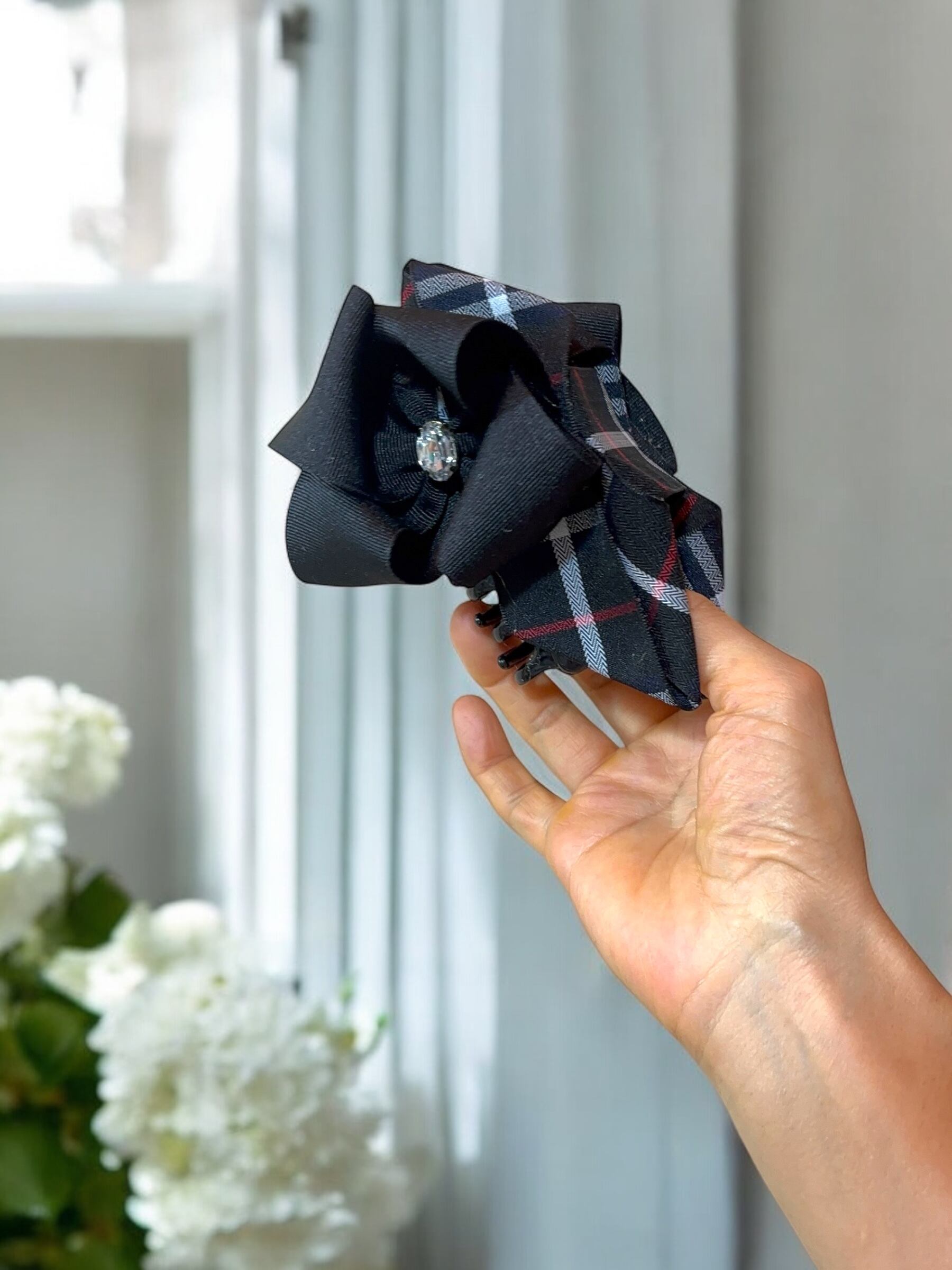 シンプルなブラックチェックにブラックのアクセントが施された、洗練されたデザインのバンスクリップです。真ん中にはキラキラビジュー